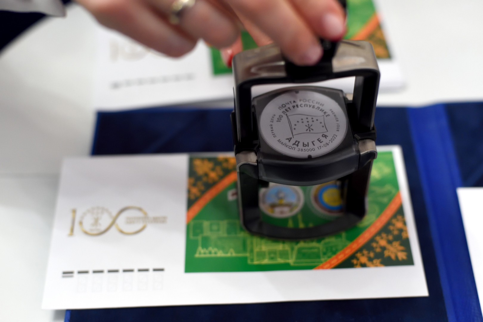Дополнительно к выпуску почтового блока издан конверт первого дня и изготовлен штемпель с фиксированной датой – его оттиск можно будет поставить только 17 августа в центральном почтовом отделении Майкопа. На конверте для гашения изображен логотип юбилея, на специальном штемпеле – флаг республики.
