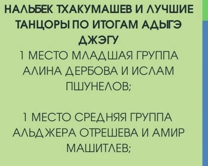 Адыгэ Хасэ Краснодарского края выражает благодарность художественному руководителю народного ансамбля адыгского танца «Абреки» Нальбеку Тхакумашеву за идею и реализацию замечательного проекта, который носил в себе не только развлекательный, но и глубинный, духовно-нравственный подтекст.