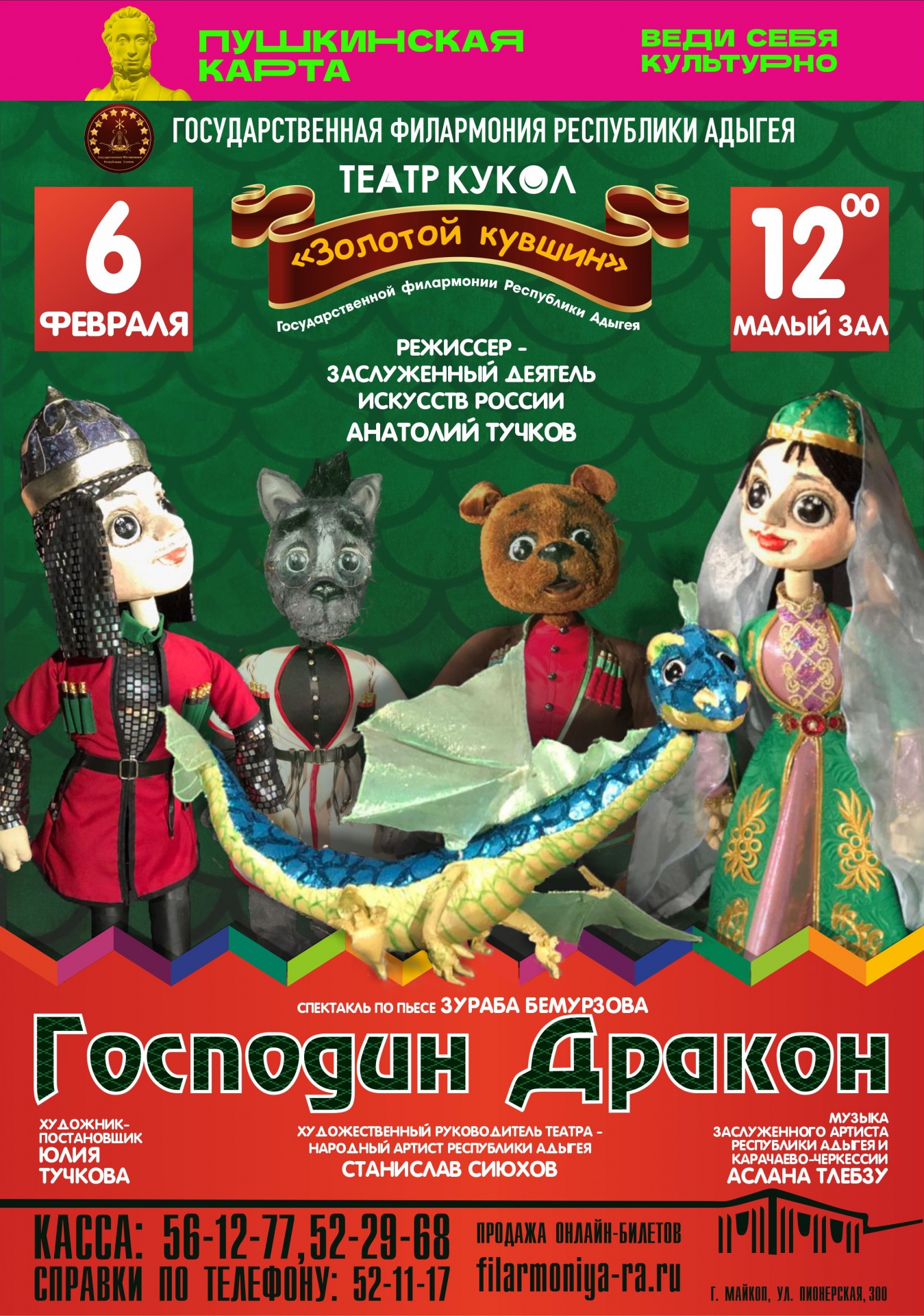 6 февраля 2022 г. в 12-00 в Малом зале Государственной филармонии Республики Адыгея Театр кукол «Золотой кувшин» представит спектакль «Господин Дракон», поставленный по пьесе Зураба Бемурзова.