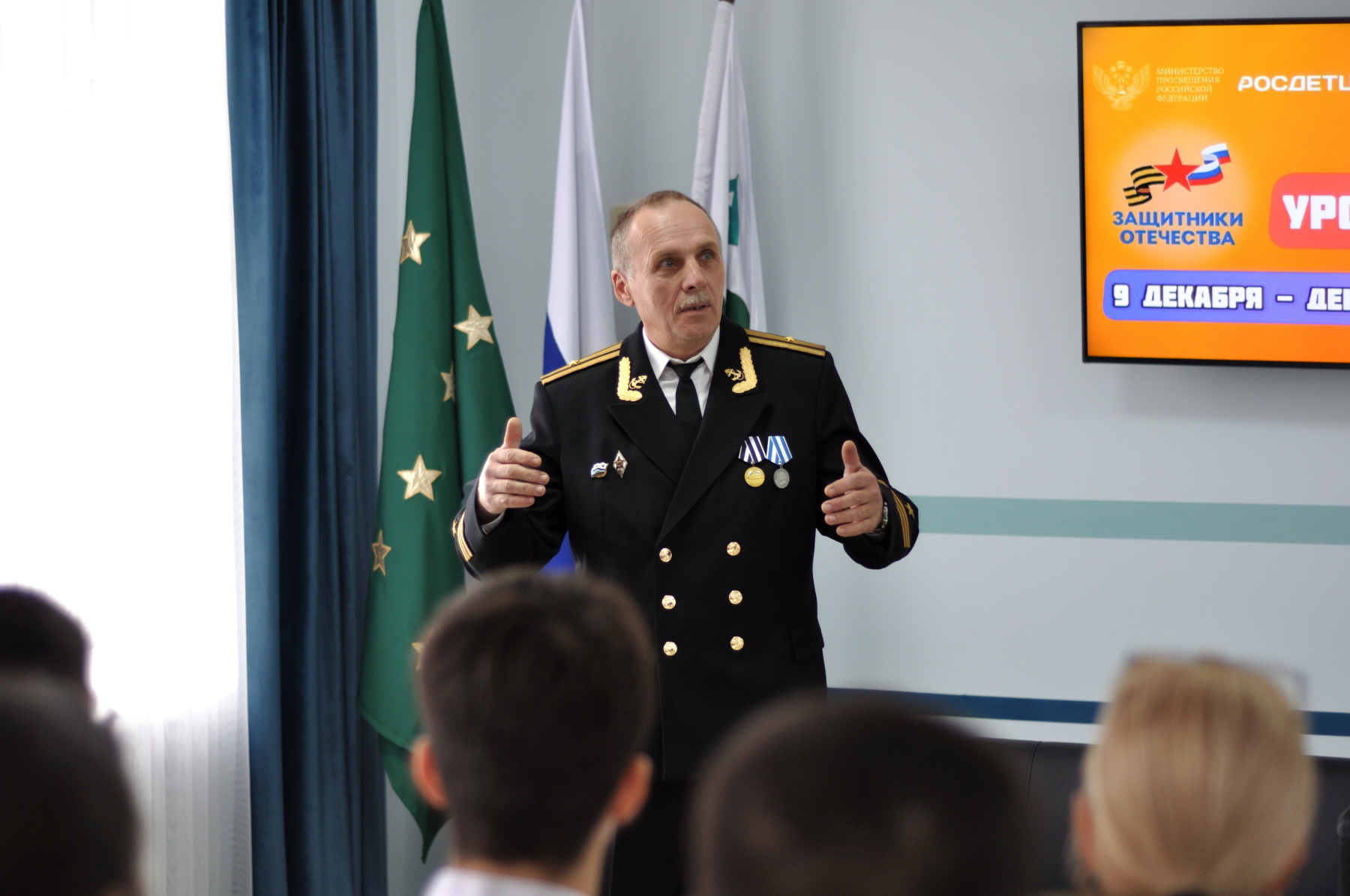 В преддверии Дня Героев Отечества по инициативе Фонда «Защитники Отечества» участник специальной военной операции, военный моряк, капитан третьего ранга в отставке Олег Спиряков провел урок мужества для девятиклассников Адыгейской республиканской гимназии.