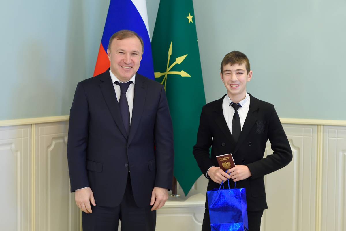 В торжественной обстановке школьники региона, добившиеся успехов в учебе, творчестве, спорте и общественной работе, лично получили из рук Главы Адыгеи, секретаря Регионального отделения партии «Единая Россия» Мурата Кумпилова свои первые паспорта.