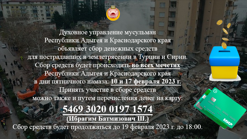 Сбор средств будет происходить во всех мечетях Республики Адыгея и Краснодарского края в дни пятничного намаза: 10 и 17 февраля 2023 г.