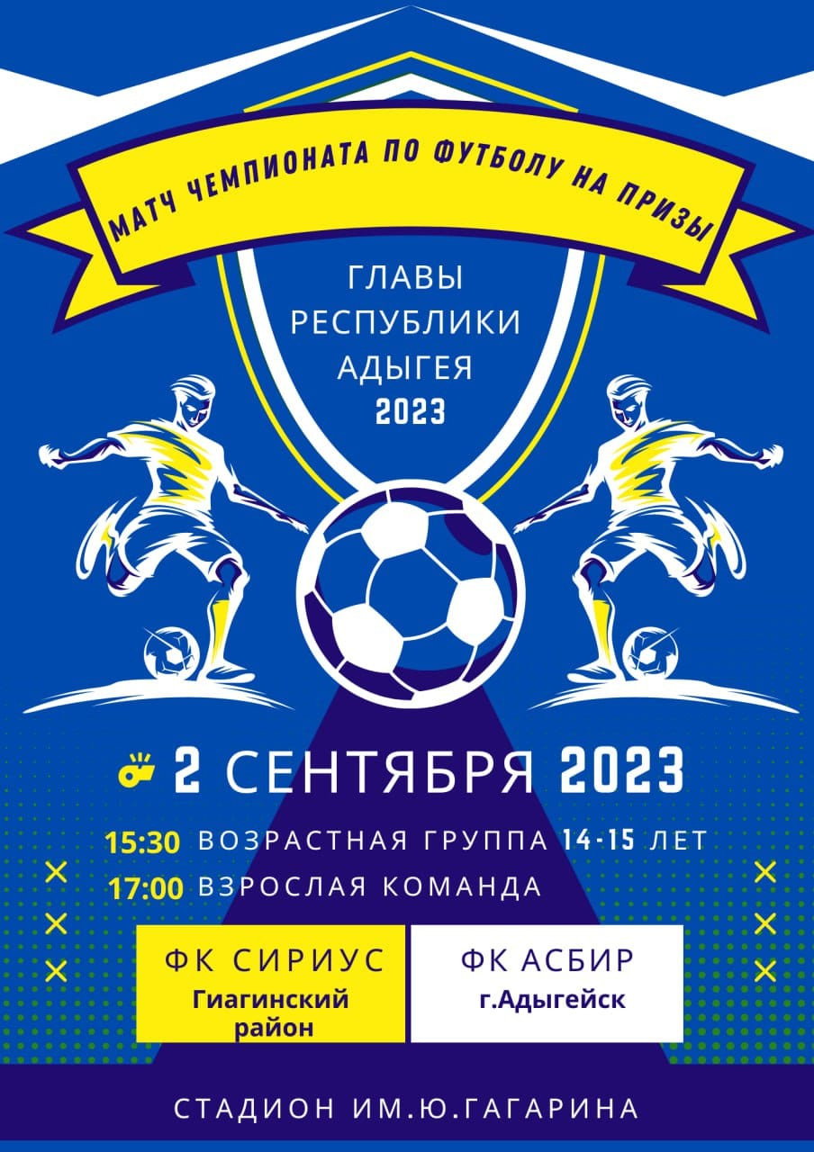 2 сентября в 15:30 на стадионе имени Ю. А. Гагарина ст. Гиагинской будет проходить матч юношеских команд Чемпионата Республики Адыгея по футболу на призы Главы Республики Адыгея 2023.