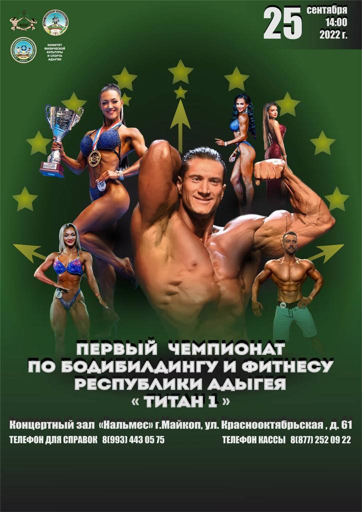 Чемпионат и первенство Адыгеи по бодибилдингу «Титан 1» пройдет с 24 по 25 сентября. Соревнования буду организованы Федерацией бодибилдинга по РА при поддержке республиканского Комитета по физической культуре и спорту.