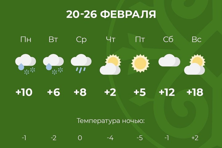 В понедельник дневная температура воздуха составит +9..+10 градусов тепла. Минимальная температура +2 градуса ожидает республику в четверг, 23 февраля. Максимальная, +18 – в воскресенье, 26 февраля. Начало недели обещает быть дождливым, возможны кратковременные осадки в виде снега.