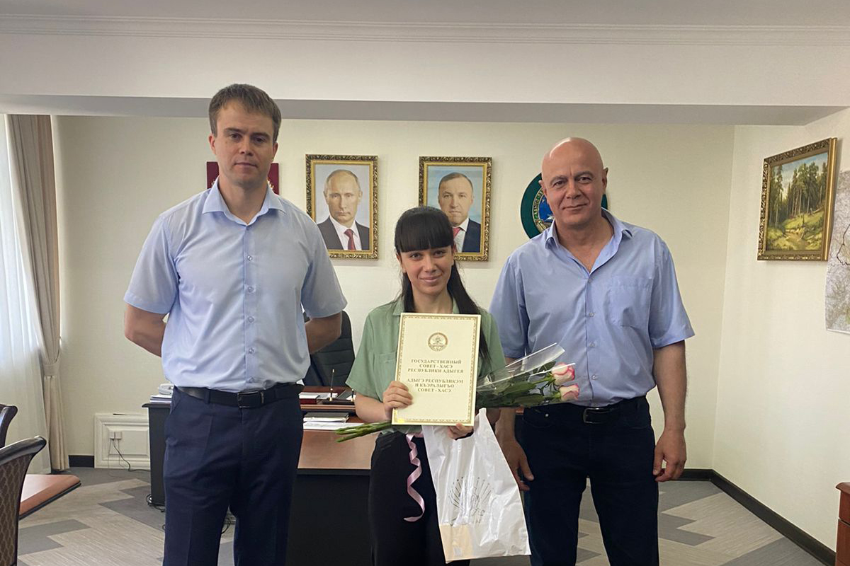 За добросовестный труд и вклад в развитие молодежной политики Республики Адыгея Благодарность Государственного Совета - Хасэ Республики Адыгея объявлена: председателю правления Адыгейского регионального отделения молодежной общероссийской общественной организации «Российские Студенческие Отряды» Ярославу Борсуку, председателю Союза студентов и аспирантов ФГБОУ ВО «Адыгейский государственный университет» Бэле Ешевой , генеральному директору АНО «Ресурсный центр гражданского общества Адыгеи», федеральному тренеру Ассоциации тренеров Российского Союза Молодежи Виктории Новицкой , советнику ректора ФГБОУ ВО «Майкопский государственный технологический университет», заместителю председателя АРО ООО «Российский Союз Молодежи» Павлу Дорошенко , специалисту отдела молодежной политики ФГБОУ ВО «Адыгейский государственный университет», заместителю председателя АРО ООО «Российский Союз Молодежи» Зауру Абрегову.