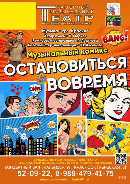 Пьеса «Остановиться вовремя» посвящена проблеме вовлечения подростков и молодежи в незаконный оборот наркотиков. Как поясняет автор, каждый раз, совершая тот или иной поступок, делая выбор или очередной жизненный шаг, необходимо помнить, что вернуться в прошлое нельзя, машины времени не существует! Именно поэтому пьеса в оригинальном жанре музыкального комикса называется «Остановиться вовремя».