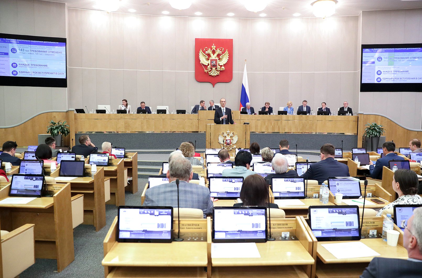С докладом по данной теме выступил заместитель Председателя Правительства РФ – Руководитель Аппарата Правительства Российской Федерации Дмитрий Григоренко . Он отметил, что работа по развитию контрольно-надзорной сферы ведется по трем направлениям: создание понятных норм и правил, прозрачные процедуры контроля и совершенствование на основе обратной связи. Было проанализировано 340 тысяч правил федерального, регионального и муниципального уровней, внесены изменения в более чем 130 федеральных законов.