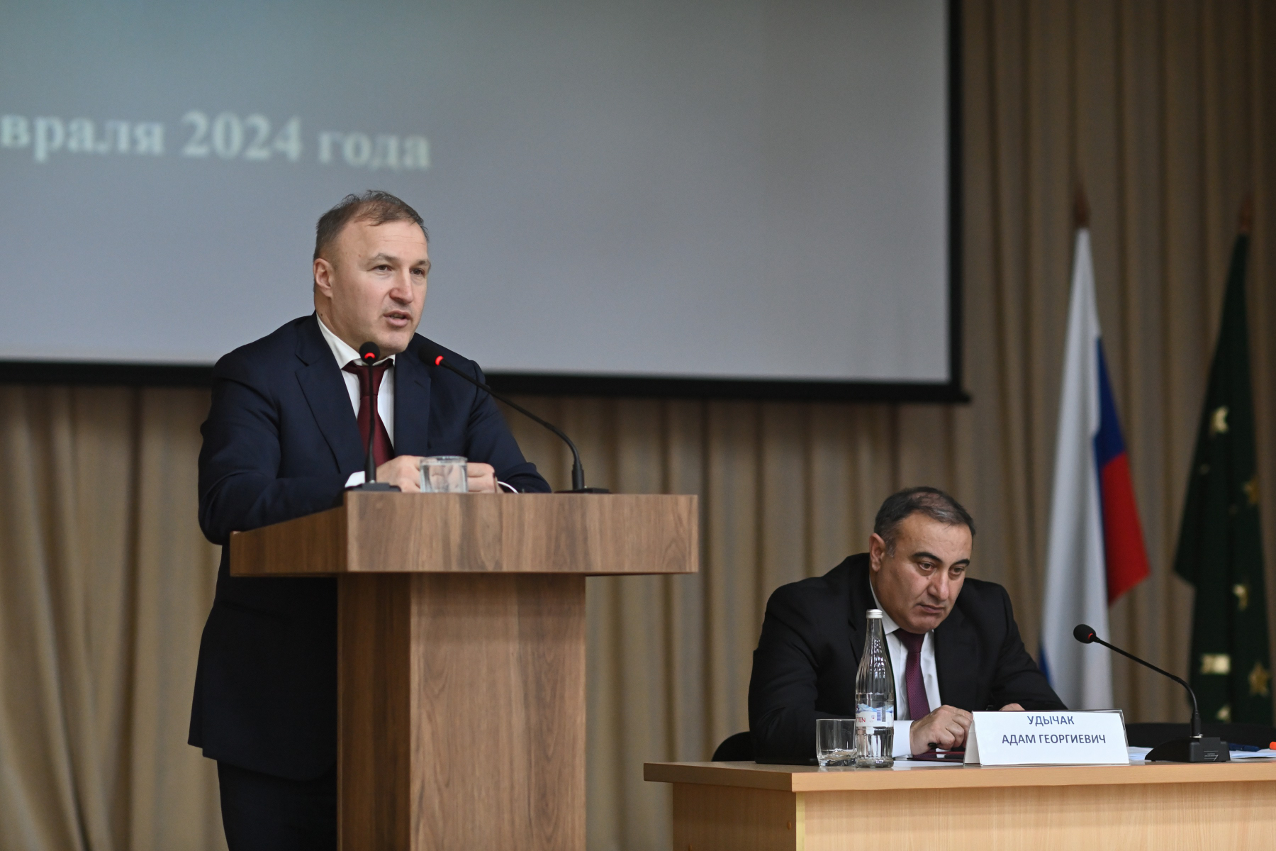 Фото: Алексей Гусев На сессии Совета народных депутатов глава Теучежского района Адам Удычак выступил с докладом по итогам работы в 2023 году.
