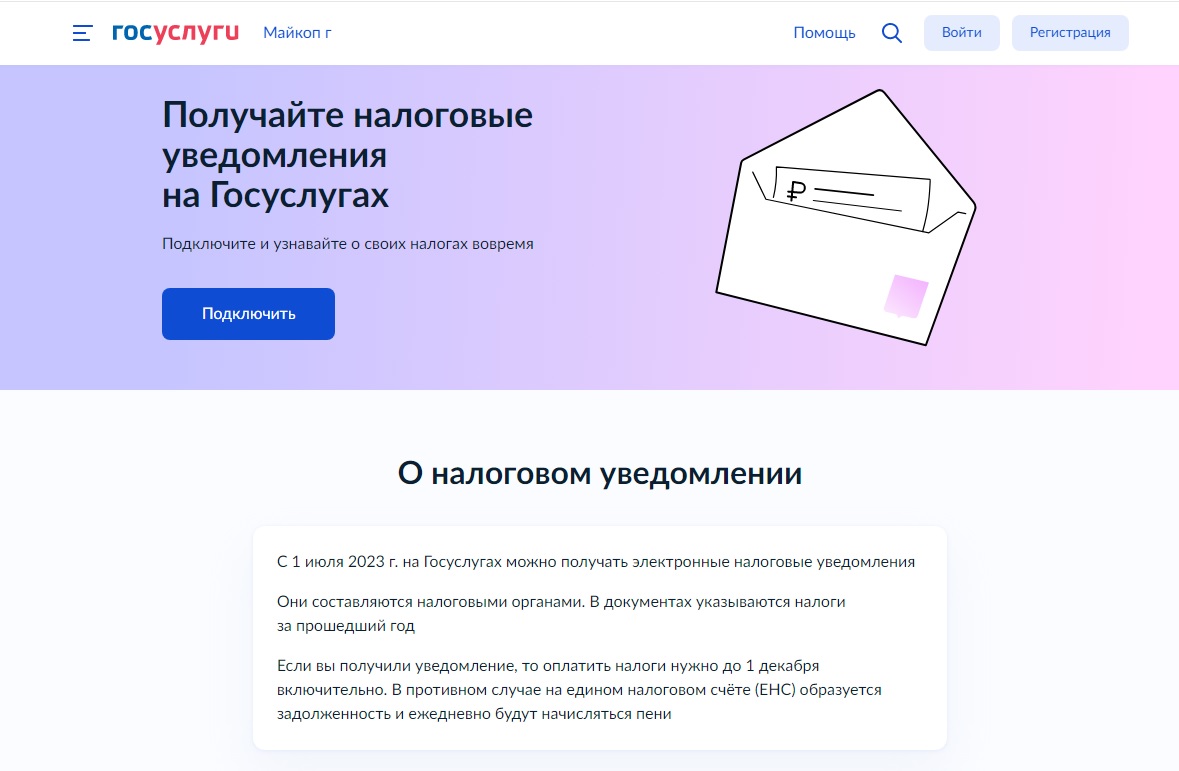 УФНС России по Республике Адыгея сообщает, что Федеральным законом от 14.04.2023 № 125-ФЗ «О внесении изменений в часть первую Налогового кодекса Российской Федерации», с 01.07.2023 года предусмотрена возможность получения налоговых уведомлений для уплаты налогов на имущество и НДФЛ, а также требований об уплате задолженности по налогам налогоплательщиками - физическими лицами в электронной форме через личный кабинет на едином портале государственных и муниципальных услуг (ЕПГУ).