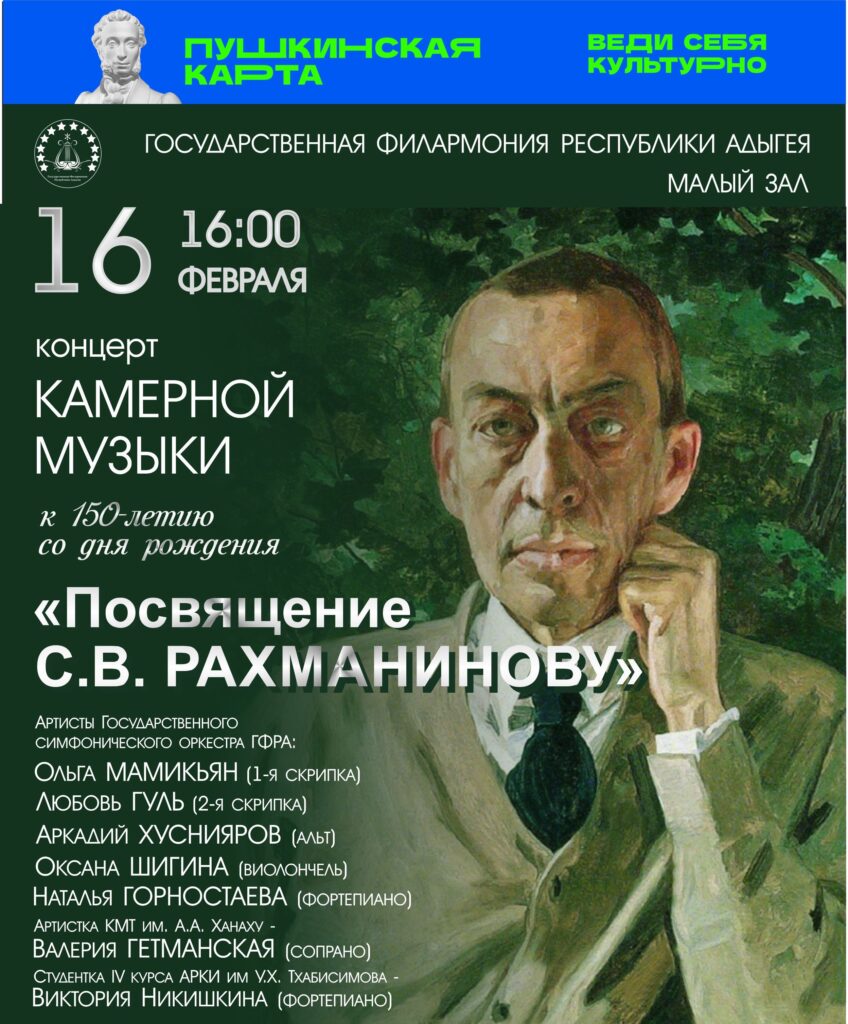 Артисты симфонического оркестра Государственной филармонии Адыгеи (малая форма оркестра) и приглашенные солисты подготовили концерт камерной музыки к 150-летию со дня рождения великого композитора Сергея Рахманинова.