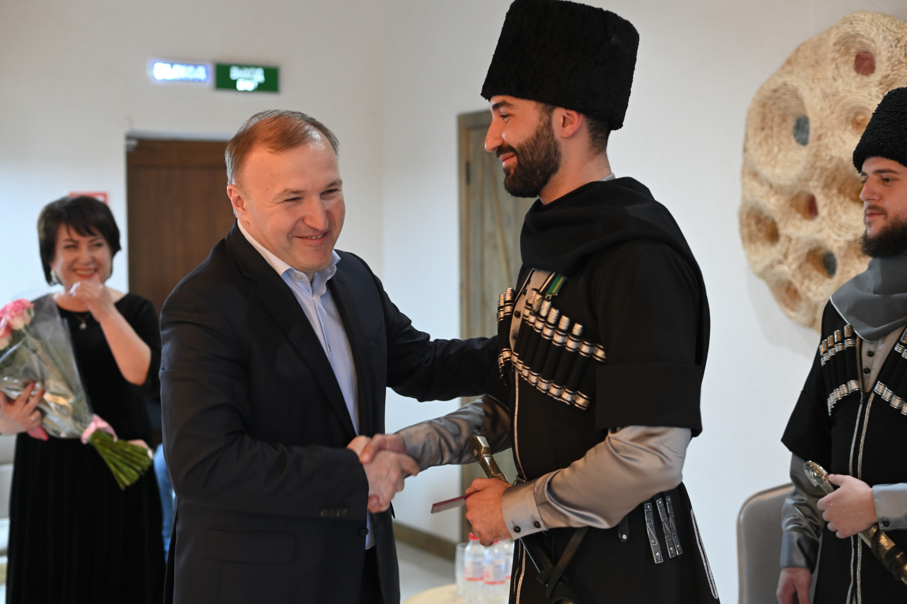 Глава региона поздравил руководителя и коллектив ансамбля с успехами в творческой деятельности, достойным участием в масштабном телепроекте, вручил всем юбилейные медали «100-летие образования Республики Адыгея» и поручил оказать ансамблю спонсорскую помощь.