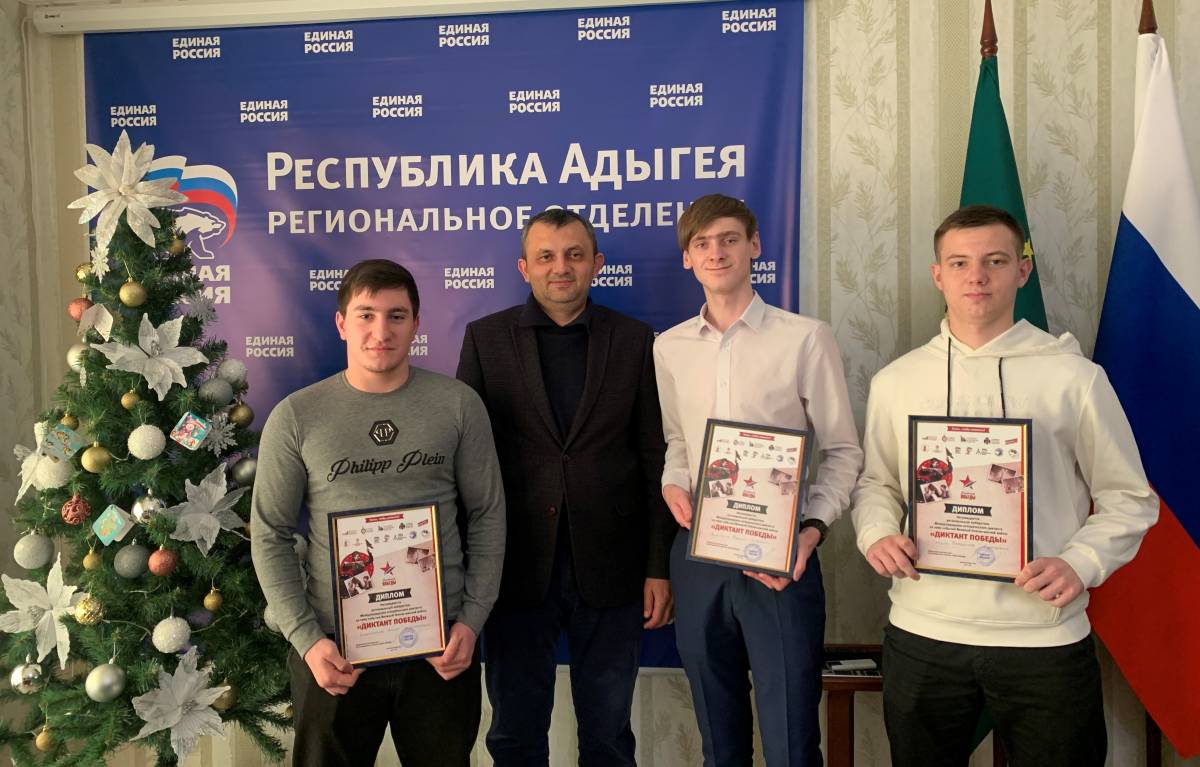 Сегодня заместитель Секретаря Регионального отделения Партии, Руководитель РИК, депутат города Майкопа Рамазан Афашагов вручил дипломы региональным победителям Международного исторического диктанта на тему событий Великой Отечественной войны «Диктант Победы». В числе победителей ученики «Средней школы № 2» города Майкопа Вадим Анастасин, Амир Хачемизов, Владислав Гайдин и жительница поселка Энем Нелли Беджашева.