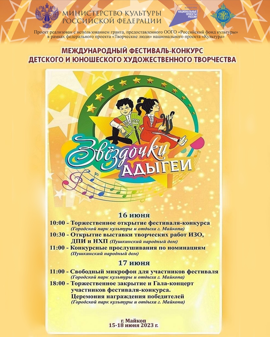 В четырнадцатый раз в г. Майкопе Республики Адыгея пройдет Международный фестиваль-конкурс детского и юношеского художественного творчества «Звёздочки Адыгеи». С 15 по 18 июня 2023 года в фестивале примут участие любительские творческие коллективы и отдельные исполнители различных жанров и направлений от 6 до 22 лет.