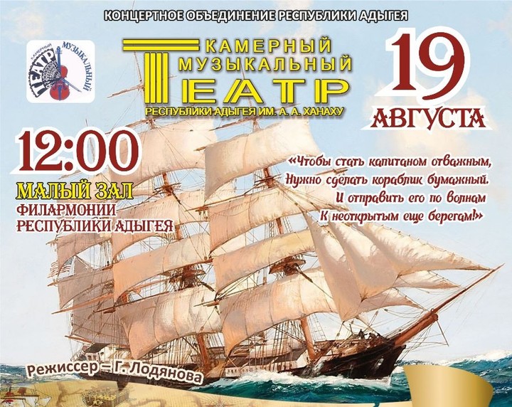 Сообщается, что 19 августа 2023 года в 12-00 в Малом зале Филармонии КОРА Камерный музыкальный театр им. А.А. Ханаху Концертного объединения Республики Адыгея представит мюзикл для детей «Отважные капитаны» (пьеса Галины Лодяновой, музыка Михаила Арзуманова).