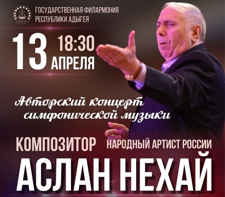 Сообщается, что 13 апреля 2023 г в 18-30 в Большом зале Государственной филармонии Республики Адыгея Государственный симфонический оркестр ГФРА представит симфоническую музыку композитора Аслана Нехая, которая является неотъемлемой частью культурного наследия всей нашей многонациональной России. Дирижёр - Каплан Сташ. (Художественный руководитель оркестра - заслуженный артист РФ, заслуженный артист КБР Петр Темирканов).