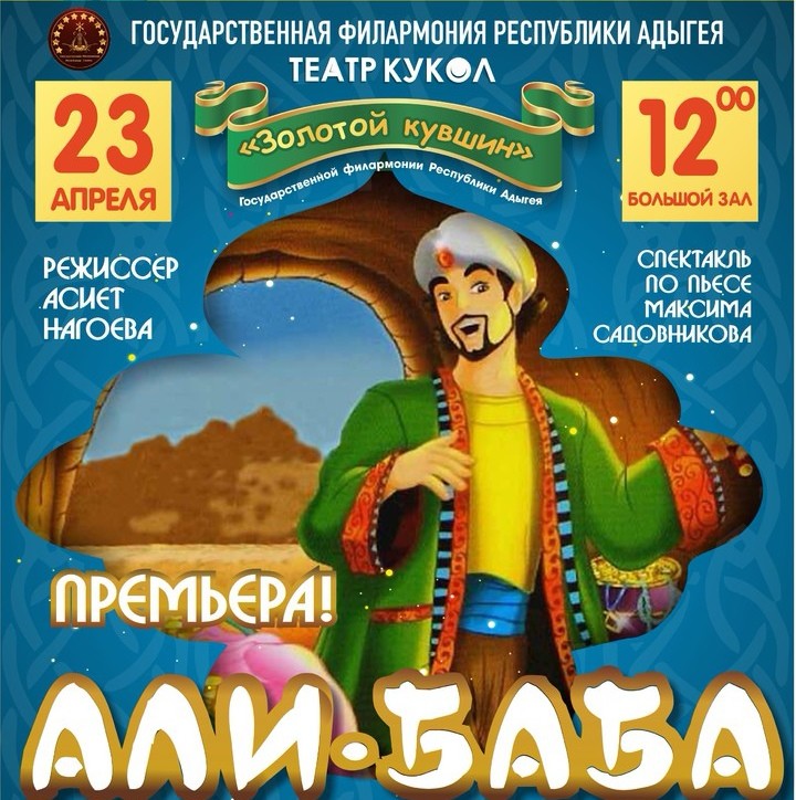 В Большом зале Государственной филармонии Республики Адыгея 23 апреля состоится премьера кукольного спектакля «Али-Баба» (по пьесе Максима Садовникова) театра кукол «Золотой кувшин» ГФРА.