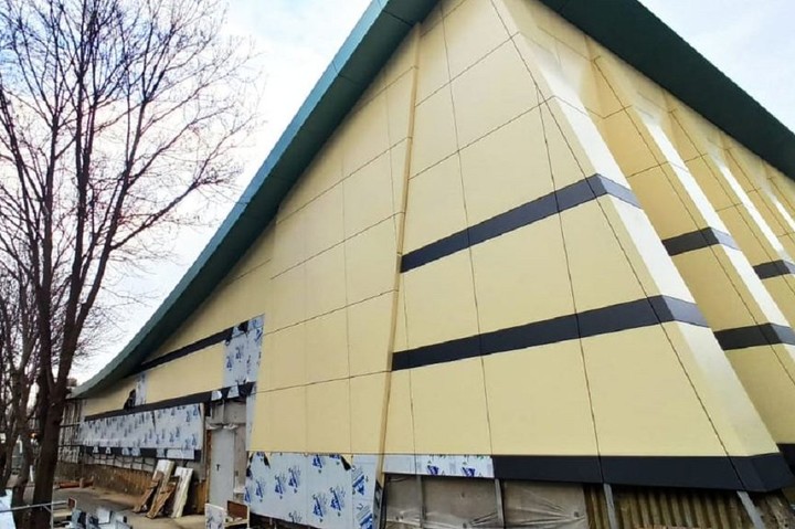 В настоящее время здесь выполнены конструкция пола и монтаж внутреннего электроснабжения с установкой светильников. Закончены монтажные работы по установке оборудования постановочного освещения и системы звукоусиления. Ведется установка кресел в зрительном зале, также завершаются работы устройству вентилируемого фасада здания.