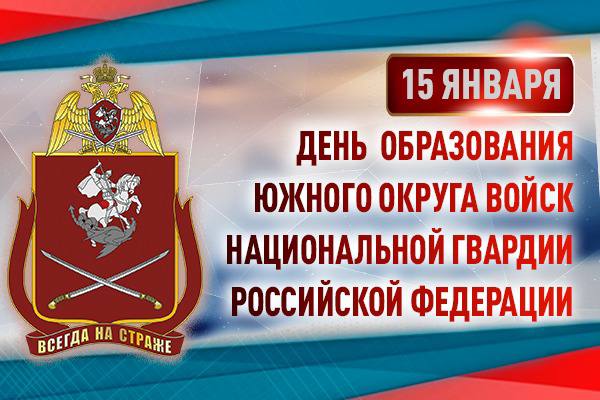 Командование и военный совет поздравляют личный состав, ветеранов, членов их семей с 30-летним юбилеем со дня образования Южного округа войск национальной гвардии Российской Федерации и желают здоровья, благополучия, успехов и мирного неба.