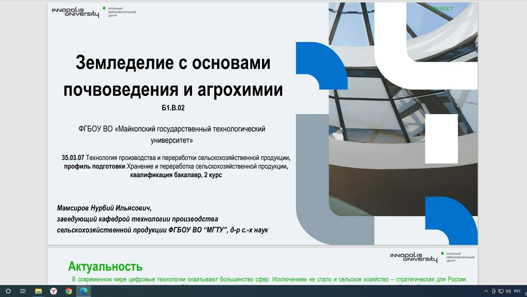 По итогам курсов за активное участие и высокий уровень профессионализма, проявленные на итоговых защитах проектов, зав. кафедрой технологии производства сельскохозяйственной продукции Нурбий Мамсиров оказался в числе 20 лучших слушателей, получивших этот статус. Его актуализированная РПД выставлена на сайте Университета Иннополис. Экспертная комиссия отметила, что в работе Нурбия Мамсирова подробно раскрыто применение сквозных технологий и педагогических цифровых инструментов, применяемых в отрасли и образовательном процессе.