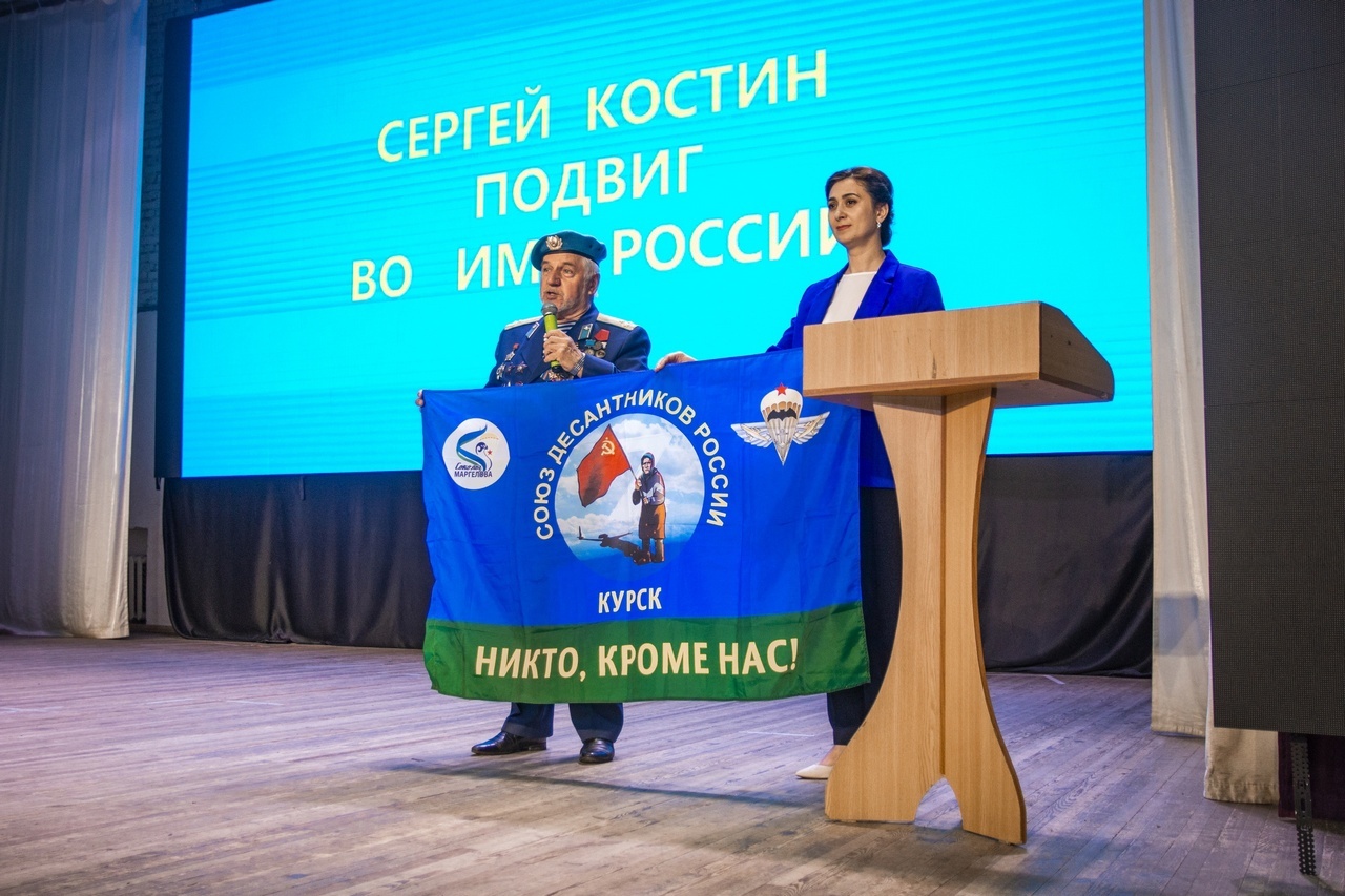 В рамках проекта «Подвиг во имя России» ветераны воздушно-десантных войск провели для ребят военно-патриотическое мероприятие: гости пообщались со слушателями и продемонстрировали короткий документальный фильм, посвящённый подвигу Героев РФ Сергея Костина и Эдуарда Цеева .