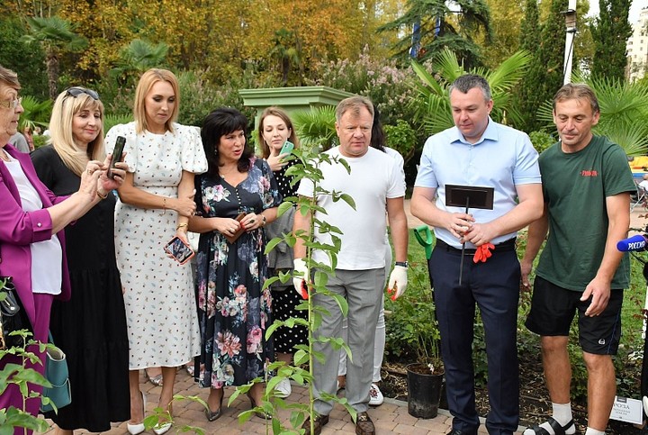 На открытии розария народный артист РФ, основатель фестиваля Sochi Jazz Festival Игорь Бутман и олимпийская чемпионка, теннисистка Елена Веснина заложили «капсулу времени 2022 года».
