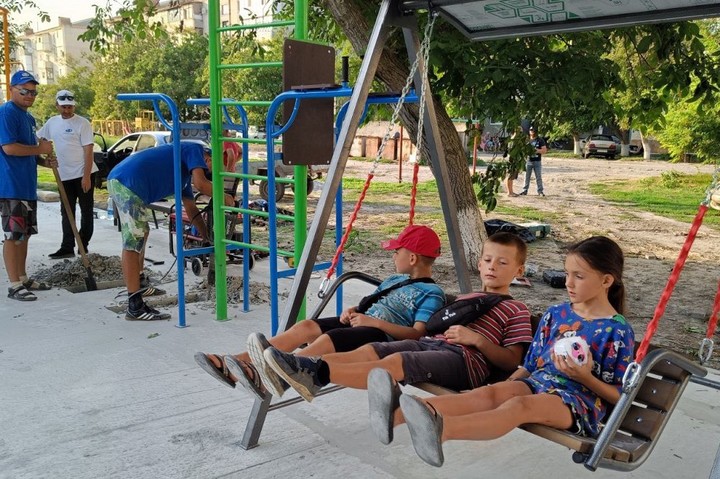В подшефном Адыгее Геническе Херсонской области строители из республики начали монтаж детских площадок.