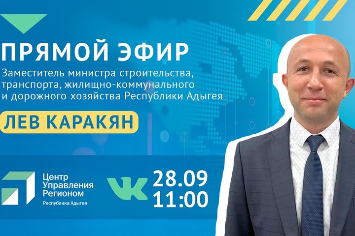 Лев Каракян, заместитель министра строительства, транспорта, жилищно-коммунального и дорожного хозяйства РА, в прямом эфире расскажет о проектах по благоустройству, которые сейчас реализуются в Адыгее.