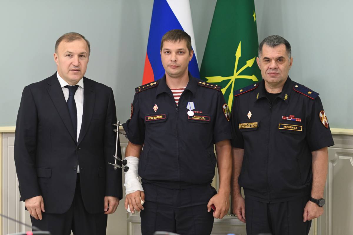 В Доме правительства РА состоялась Церемония вручения государственных наград военнослужащим и сотрудникам Управления Росгвардии по Республике Адыгея, отличившимся в ходе выполнения служебно-боевых задач. Награды вручил Глава Адыгеи, секретарь Регионального отделения партии «Единая Россия» Мурат Кумпилов .