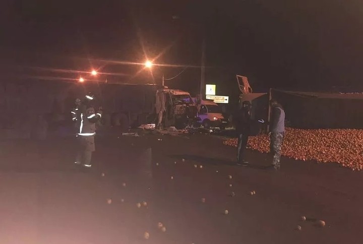 По сообщению, опубликованному в телеграм-канале Тимашевского аварийно-спасательного отряда, один из грузовиков перевозил яблоки, которые рассыпались на дорогу после опрокидывания.