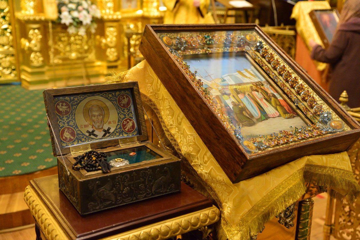 Перед началом чина освящения храма Его Высокопреосвященство возглавил встречу ковчега с частицей мощей святителя и чудотворца Николая, архиепископа Мир Ликийских, который был передан из Свято-Троицкого кафедрального собора города Майкопа в Свято-Никольский храм на постоянное пребывание.