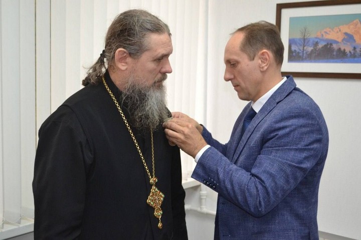 Глава Майкопского района Михаил Марьин вручил юбилейную медаль «100 лет Республики Адыгея» настоятелю Свято-Михайло-Афонской Закубанской общежительной мужской пустыни игумену Герасиму (Александру Буняеву).