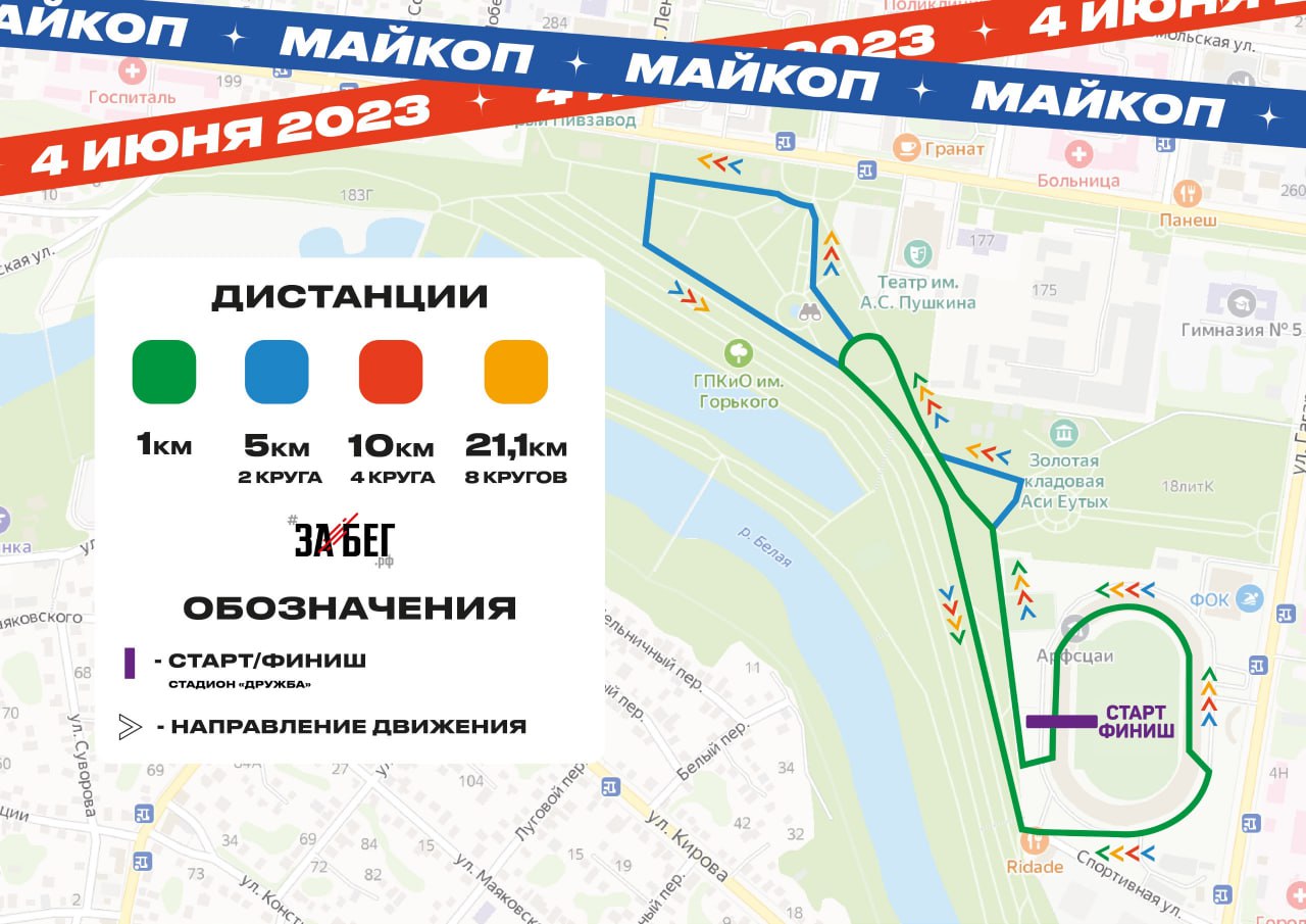 Участникам будут предложены четыре дистанции – километр, 5, 10 и 21,1 км. Маршрут пройдет по территории республиканского стадиона и городского парка культуры и отдыха города Майкопа.